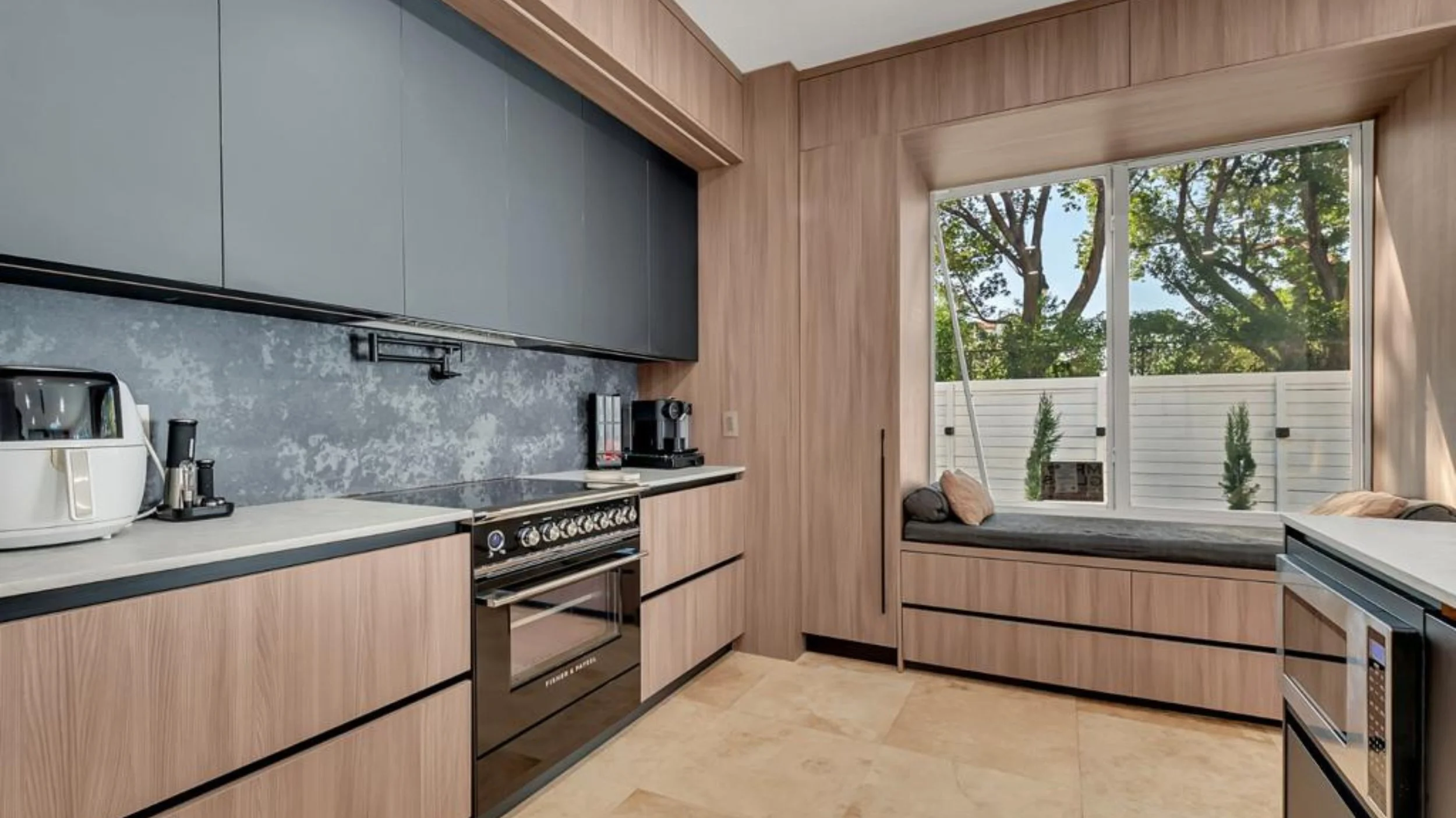 Modern kitchen with natural wood cabinets, black appliances, and a cozy window seat with cushions by large window overlooking trees.